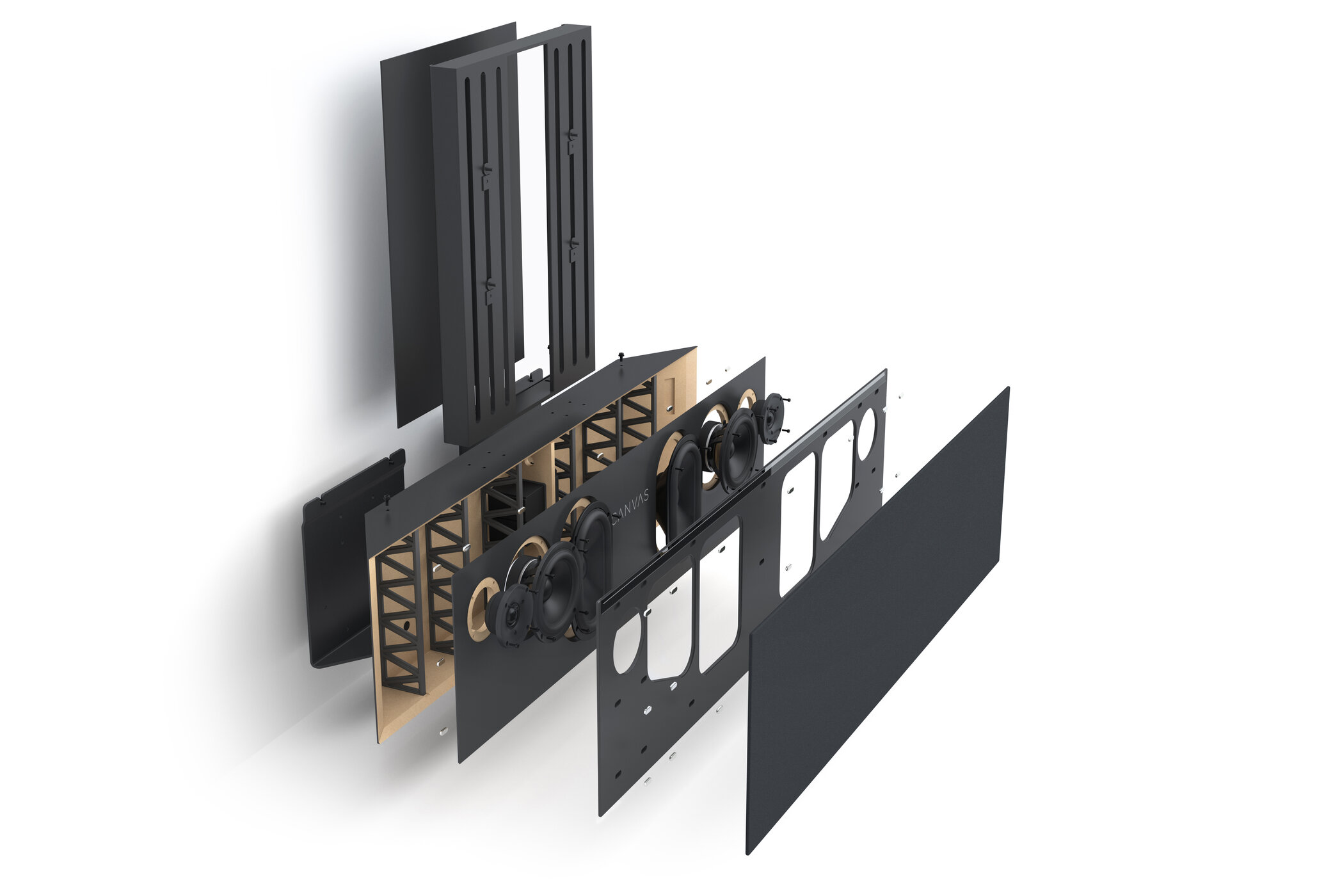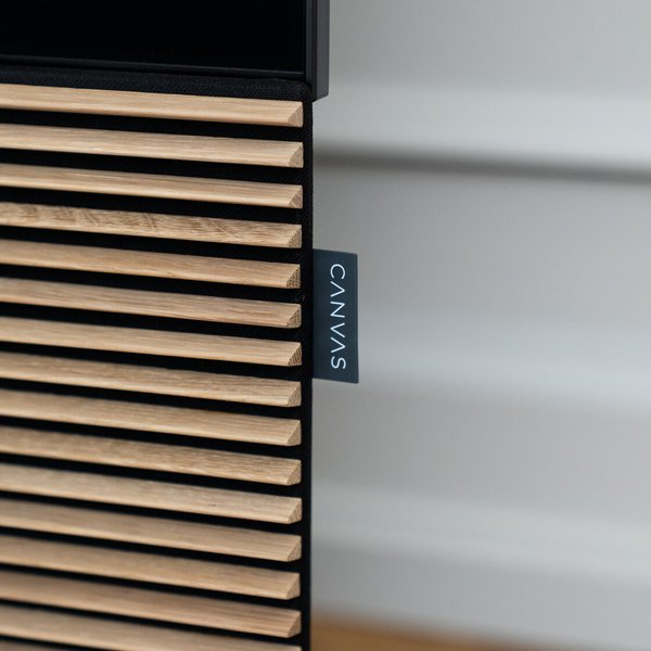 Im Inneren The HiFi Frame befindet sich die preisgekrönte Soundbar von CANVAS. Zwei 6,5-Zoll-Tieftöner und zwei 5×8-Zoll-Passivradiatoren von SB Acoustics bewegen die Luft mit der Autorität eines 12-Zoll-Subwoofers - ohne eine Box in den Raum zu stellen. Das 24-Liter-Gehäuse lässt den Bass atmen, während Stimmen nah und verständlich bleiben.